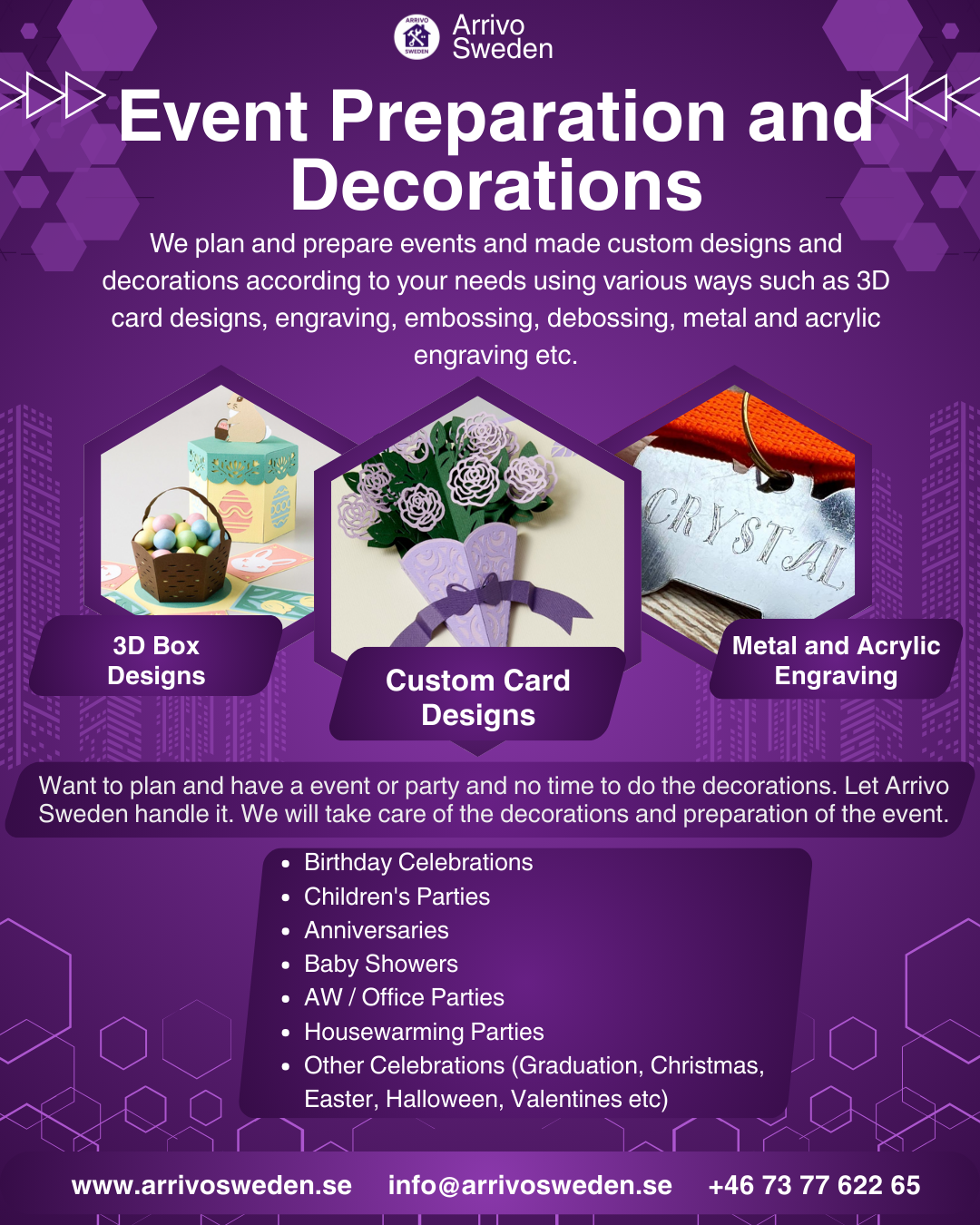 Want to plan and have a event or party and no time to do the decorations. Let Arrivo Sweden handle it. We will take care of the decorations and preparation of the event.