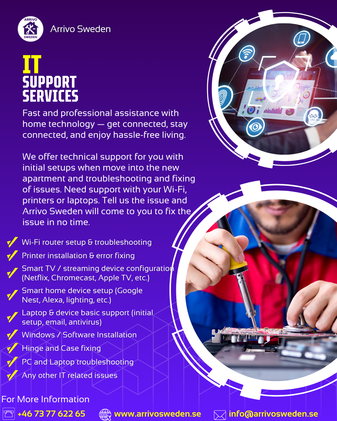 Need support with your Wi-Fi, printers or laptops. Tell us the issue and Arrivo Sweden will come to you to fix the issue in no time.